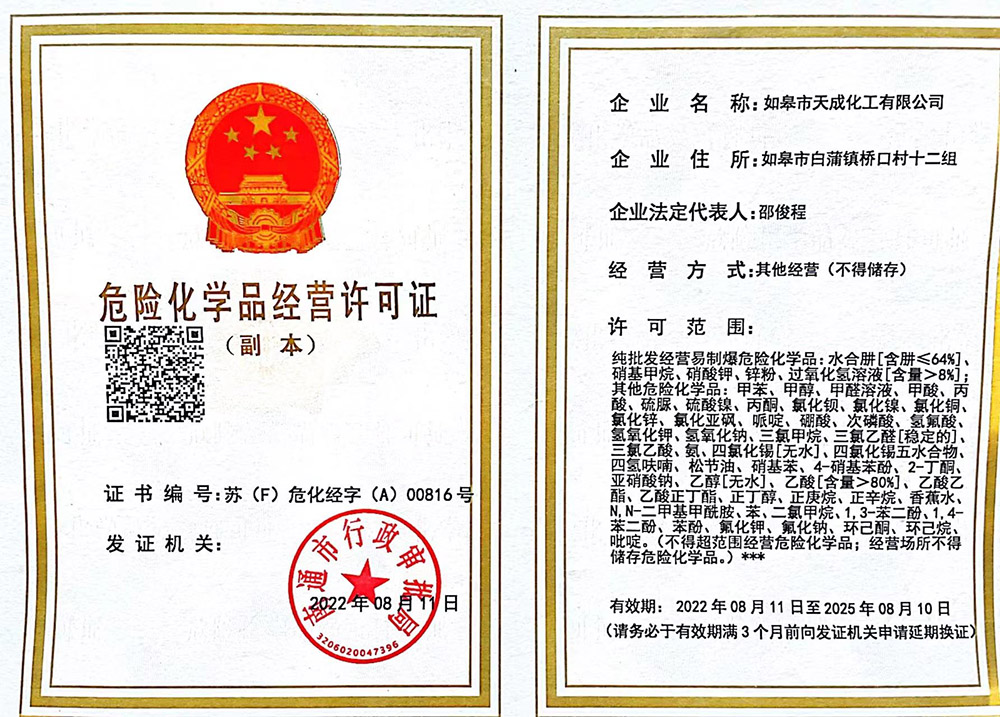 ? 如皋市天成化工有限公司創(chuàng)建于1996年。公司地處于美麗富饒的長江三角洲,座落在古鎮(zhèn)林梓,通揚運河河畔。南瀕長江、西臨204國道,距南通港、飛機場30公里,立體交通發(fā)達。公司經(jīng)營管理規(guī)范,技術(shù)力量雄厚,擁有一批高、中級專業(yè)技術(shù)人才。